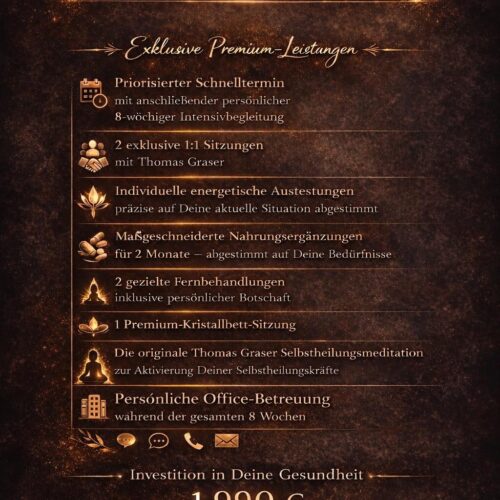 8 Wochen lang findet wöchentlich eine Fernbehandlung statt und es werden zwei klare, persönliche Botschaften von Thomas Graser übermittelt! Unter Vorname, Nachname, Geburtsdatum, etc. sind die Daten jener Person einzugeben, welche behandelt wird.