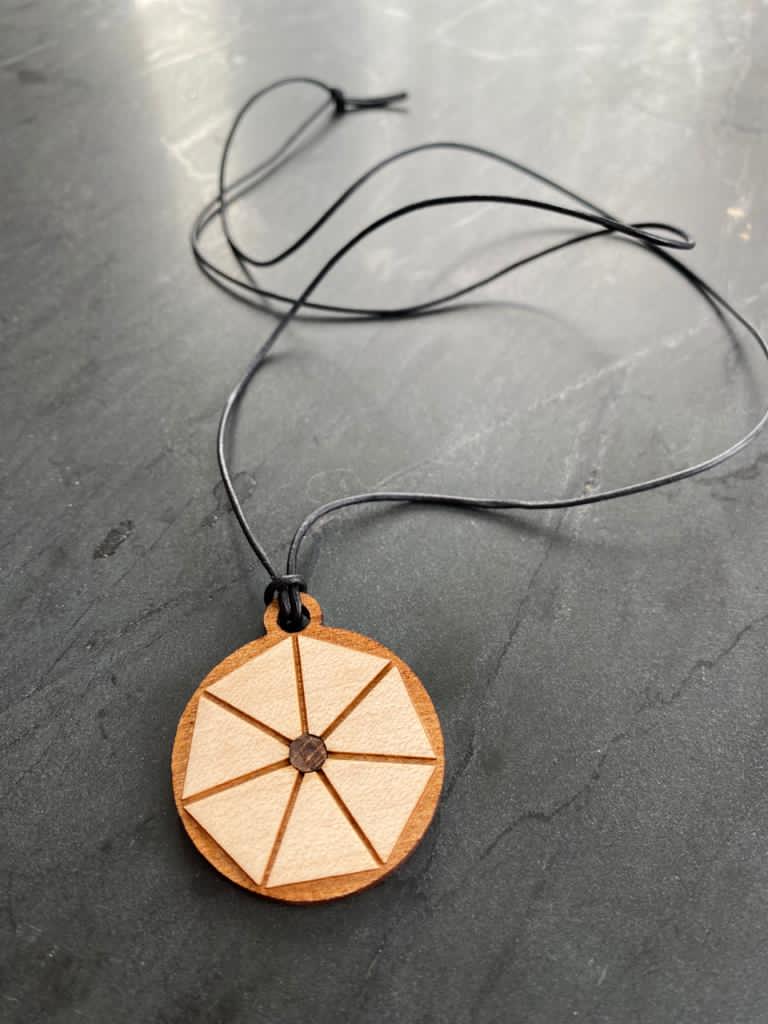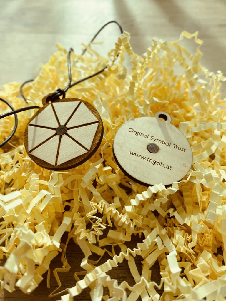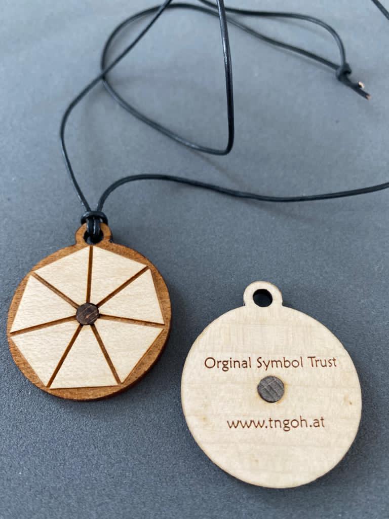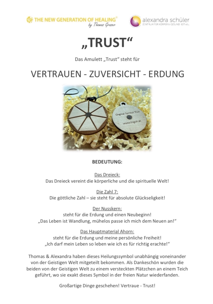 Unser Symbol-Amulett-„TRUST“ wurde uns, Thomas Graser und Alexandra Schüler, von der geistigen Welt durchgegeben. Es steht für Vertrauen-Zuversicht-Erdung. Hochwertige, natürliche Materialien wie Ahorn-Holz und der Nusskern sind die Basis dafür. Das Amulett hat einen Durchmesser von 35mm und kann mit schwarzem oder braunem Lederband bestellt werden. Der Preis versteht sich inklusive dem Lederband.